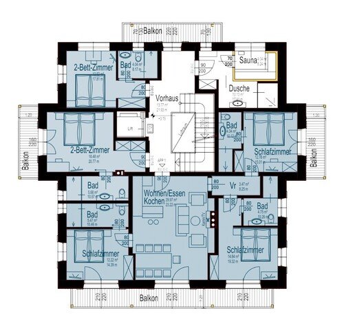 An entire floor just for you! Three bedrooms and bathrooms in the apartment and two more double rooms with their own bathrooms right next door. Perfect when everyone wants to be together, but still have their own space. In the large kitchen and the cozy living and dining area, you can cook together, chat, and enjoy time together.
