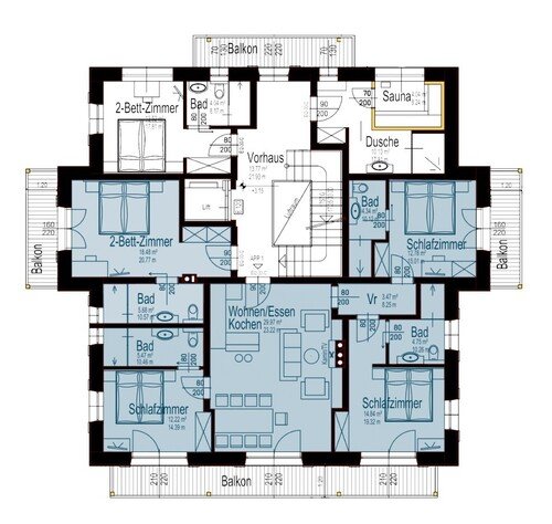 The 112 m² apartment offers three bedrooms with super comfortable double beds and three bathrooms with shower and toilet. There is also an additional double room with its own bathroom and a sauna on the same floor. The fully equipped kitchen leaves nothing to be desired.